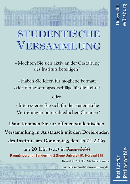 Studentische Versammlung Datum: 15.01.2026, 20:00 Uhr Ort: Sanderring 2 (Neue Universität), HS 318 Zurück