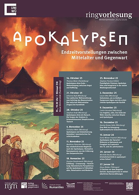 Das Würzburger Kolleg Mittelalter und Frühe Neuzeit veranstaltet im Wintersemester eine Ringvorlesung zum Thema Apokalypsen. Das Programm finden Sie hier.
