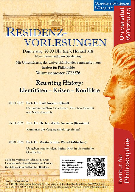Da der Toscana-Saal aus feuerschutztechnischen Gründen bis auf Weiteres nur mit max. 30 Personen belegt werden darf, findet die Residenzvorlesung im Wintersemester 2025/26 in der Neuen Universität am Sanderring in Hörsaal 318 statt. Für den anschließenden Umtrunk heißen wir Sie jedoch wie üblich in den Räumen des Instituts für Philosophie im Erdgeschoss der Residenz willkommen.