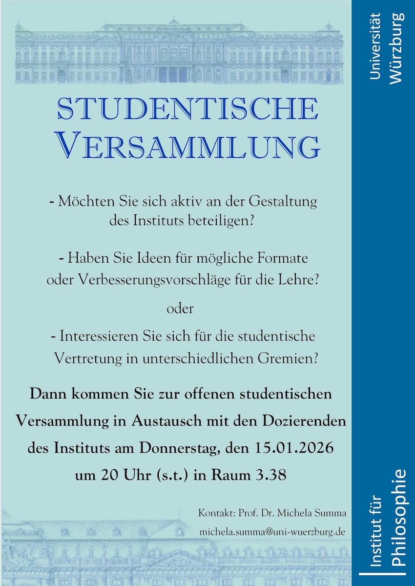 - 13.10.2025, 17:00–18:00 Uhr, Institut für Philosophie, R. 28: Einführungsveranstaltung für Bachelorstudierende
