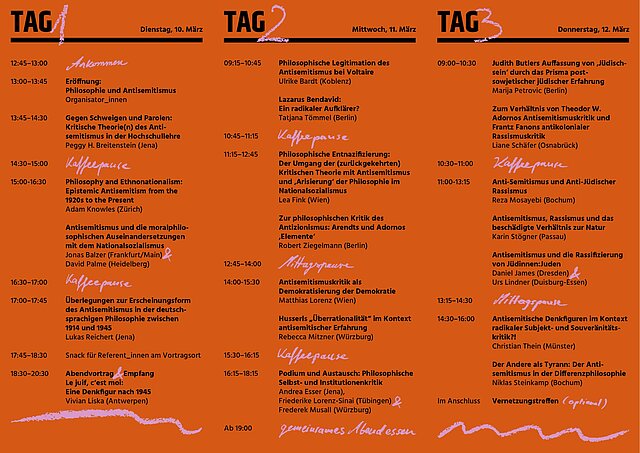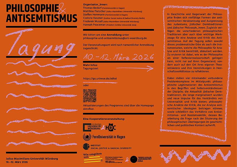 In Geschichte und Gegenwart der Philosophie finden sich vielfältige Formen der antisemitischen Herabsetzung und Ausgrenzung des Judentums, jüdischer Denktraditionen und jüdischer Philosoph:innen. Zugleich verfügen die verschiedenen philosophischen Traditionen aber auch über wichtige Werkzeuge für eine Analyse und Kritik des Antisemitismus. Auf der Tagung soll sowohl dieses problematische Erbe Gegenstand sein als auch die Instrumentarien, welche die Philosophie für Analyse und Kritik bereithält, diskutiert werden. Zu eruieren ist dabei, wie es der Philosophie als einer Reflexionswissenschaft gelingen kann, nicht nur auf ihren Gegenstand, sondern auch auf den Ort ihres eigenen Theoretisierens und ihre Verstrickungen in Herrschaftsverhältnisse zu reflektieren.